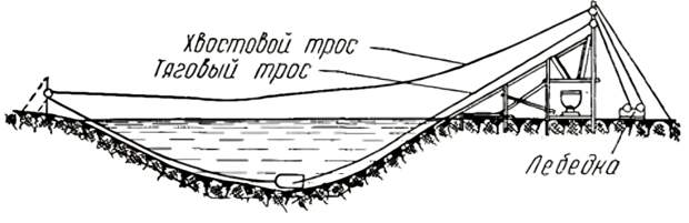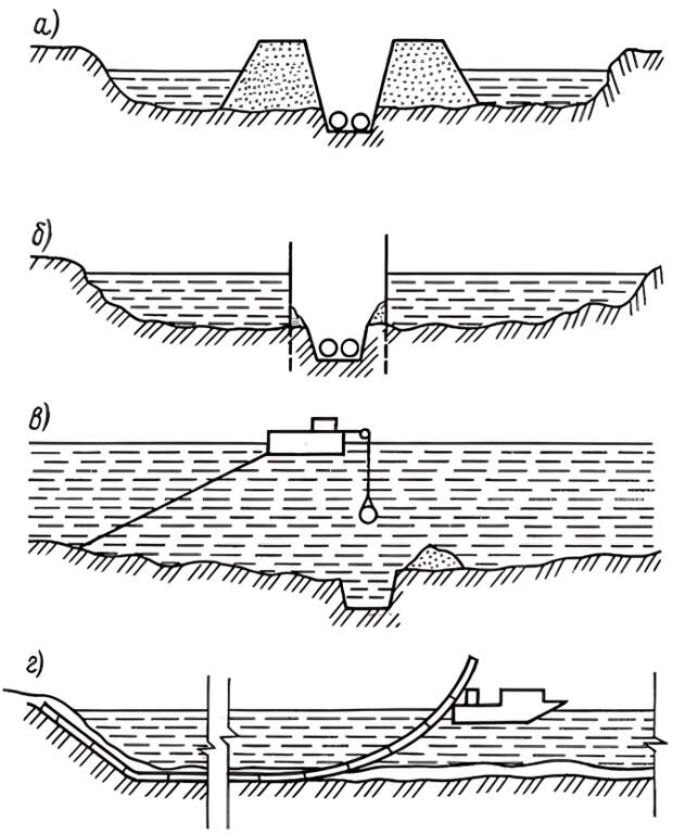 - Разработка траншеи. На дне реки траншея роется после перекрытия потока земляной или шпунтовой перемычкой, если возможно. При невозможности используются канатно-скреперные установки, гидромониторы, земснаряды или дноуглубительные снаряды (землесосы, землечерпалки). Дно траншеи проверяется нивелиром для прямолинейности или изломов с радиусом кривизны не менее 400 м.