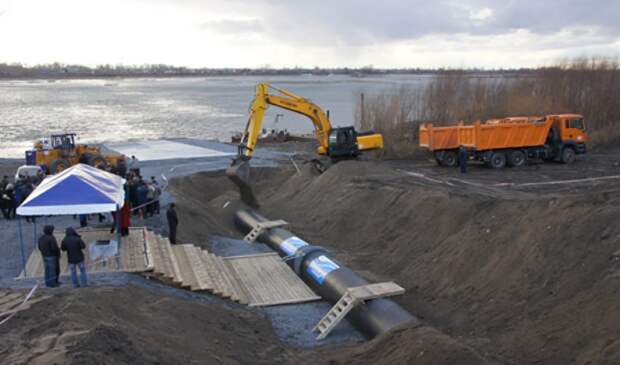 - Укладка. Методы включают протаскивание по дну (с рельсовым путем и вагонетками, тросом и лебедкой), свободное погружение, погружение с плавучих опор (понтонов для широких водоемов), последовательное наращивание или погружение со льда. Для предотвращения всплытия применяют балласт — полукольца из железобетона или седлообразные грузы. Траншея засыпается грунтом, намытым гидромониторами или привезенным на барже.