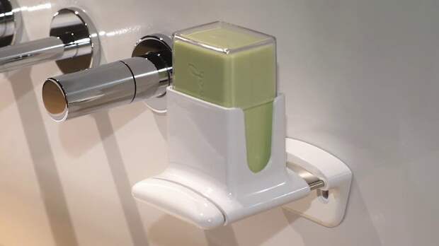 Настенная магнитная мыльница относится к подвесным конструкциям и является отличным вариантом для хранения брусочного мыла. По своей форме она напоминает небольшой кран со скрытым внутри магнитом. Для того чтобы подвесить кусок мыла к такому приспособлению, нужно вдавить второй магнит внутрь бруска, слегка смочив поверхность. По мере уменьшения объема мыла магнит смещается вглубь куска.