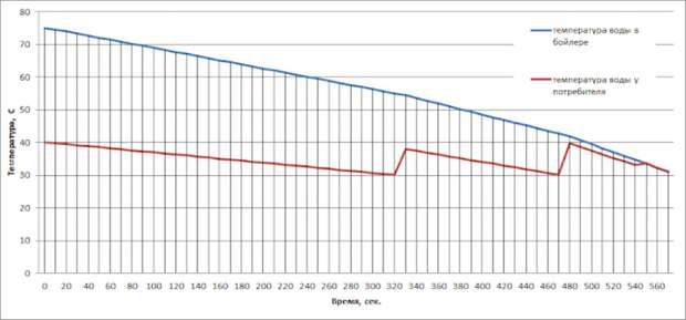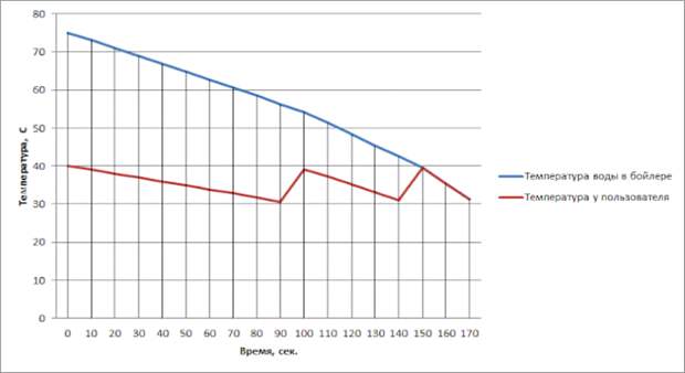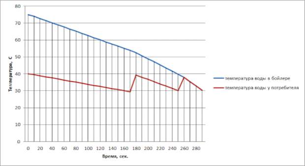 Температура более 36-38°С ощущается как теплая, 30-35°С как относительно прохладная. Таким образом, при расчете рассматривалось, что пользователь создает для себя воду с температурой 40°С , а когда ее температура падает до 30°С, то он меняет соотношение расходов горячей воды из бойлера и холодной из водопровода. Также был учтен нагрев воды в бойлере, который составляет 0,22°С за 10 секунд.