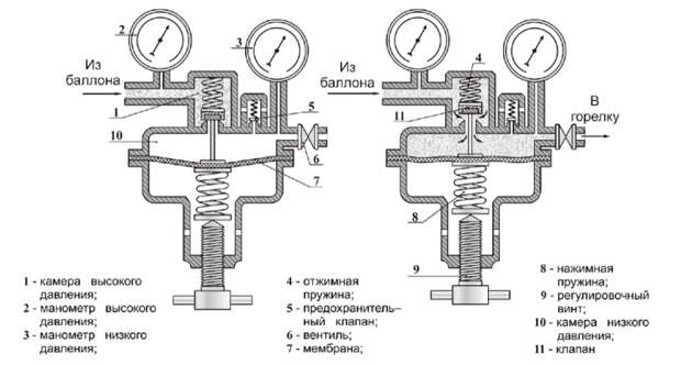 - Редукторы прямого действия. Принцип работы: Поступающий газ давит на клапан снизу, стремясь его открыть. Когда давление газа в баллоне снижается, мембрана выгибается, открывая редуцирующий клапан и подавая газ. Особенность: По мере расхода газа из баллона рабочее давление на выходе несколько снижается (падающая характеристика).