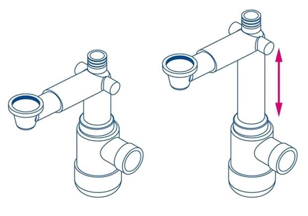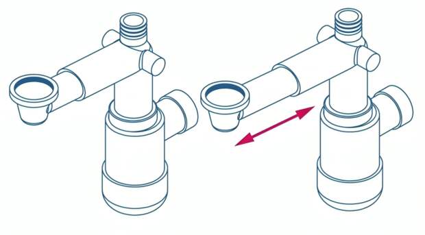 - Подвижные элементы. Возможность выдвижения горизонтальных и вертикальных патрубков на 10–15 см, а также вращение выпусков и чаш на 360 градусов. Это позволяет адаптировать сифон под конкретное расположение канализационных труб без необходимости в дополнительных переходниках.