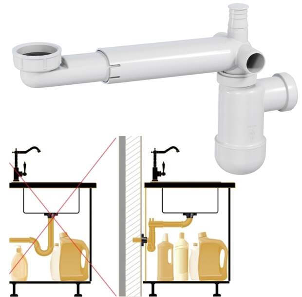 - Гибкость установки. В отличие от стационарных моделей, телескопический сифон можно смещать в сторону, освобождая пространство под раковиной для хранения вещей или установки мебели.