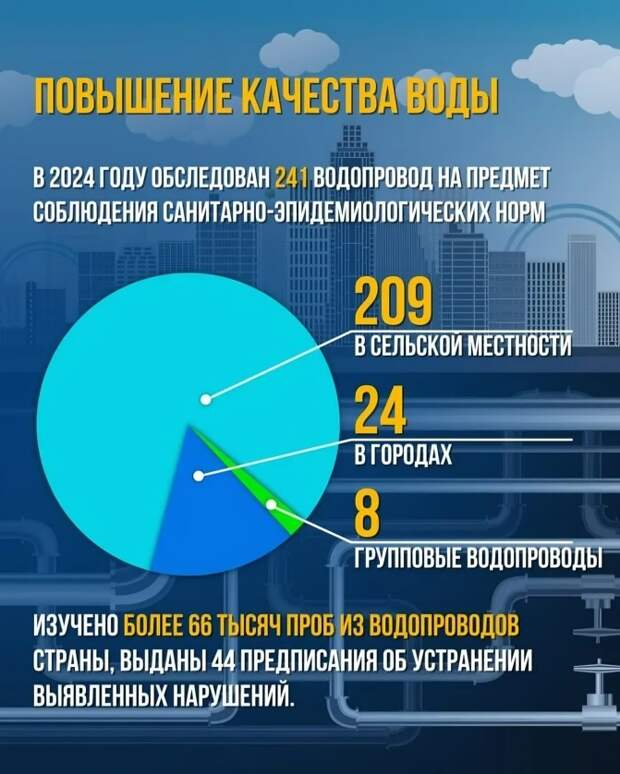 Статистика показывает проблемы, в 2023 году (последние доступные детальные данные на 2025 год) в Акмолинской области до 38% проб воды не соответствовали санитарным нормам по химическим показателям, таким как нитраты и тяжелые металлы. В целом по стране, по данным Бюро национальной статистики, доля проб, не соответствующих нормам, составляет около 10-15% в среднем, но в сельских районах может достигать 30%. Основные риски включают бактериальное загрязнение (E. coli, колиформы), химические примеси (арсен, кадмий, хлор) и повышенную минерализацию. В 2025 году введение нового Водного кодекса усилило мониторинг, но отчеты ООН указывают, что только около 60% водопроводных систем обеспечивают воду, соответствующую стандартам ВОЗ по всем параметрам.