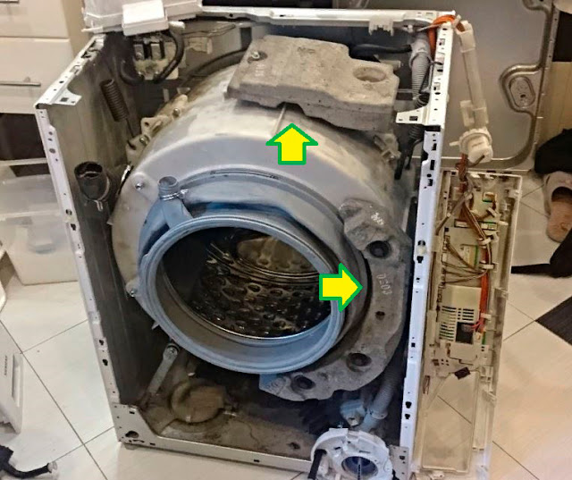 Случается так, что в пространство между барабаном и баком попадает посторонний предмет, из-за которого образуется шум и скрежет. В основном это случается, когда забывают убрать все лишнее из карманов, а так же не редкий случай когда попадает косточка от бюстгальтера. Чтобы удалить мусор, нужно снять нагревательный элемент (ТЭН) и через отверстие убрать все лишнее. Так же, можно извлечь мусор из патрубка слива.