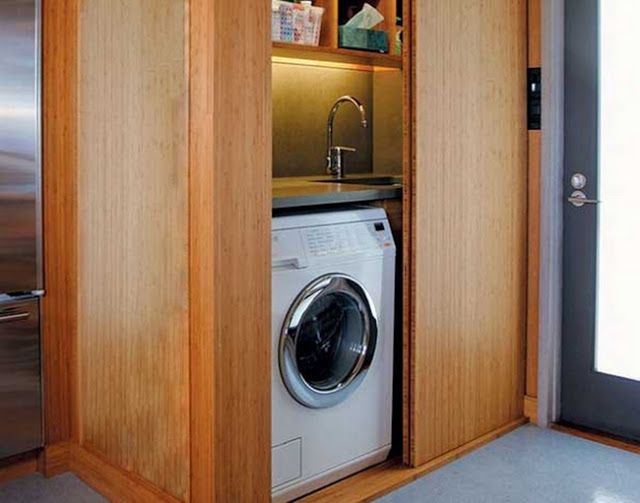 - Используя шкафы для обычной и встроенной машины, учитывайте, что им нужно несколько сантиметров для движения во время отжима, и оставляйте небольшой запас места. Иначе шкаф долго не прослужит.