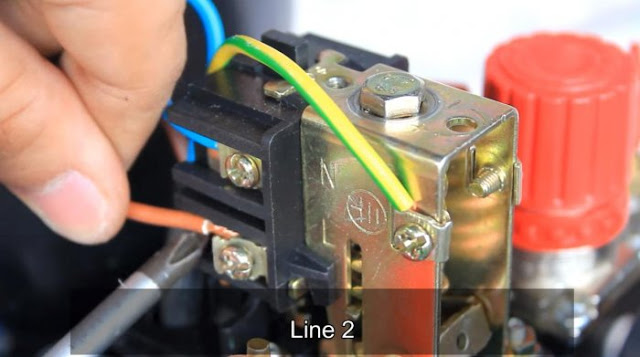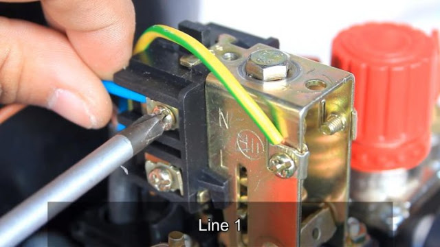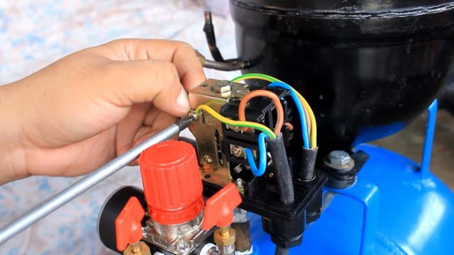 Подключаем электрику. Отверткой разбираем корпус реле давления, открывая доступ к контактам.