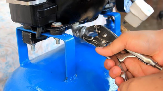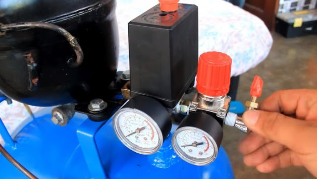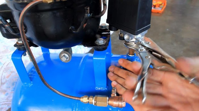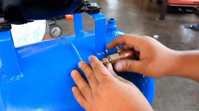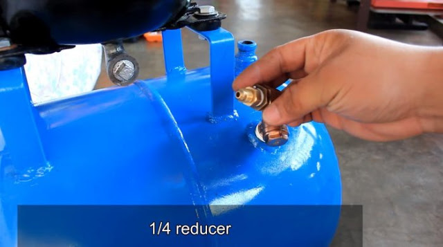 Для установки реле давления или прессостата со всей регулирующей аппаратурой монтируем еще один переходник на 1/4 дюйма. Отверстие под него делаем по центру ресивера, недалеко от компрессора.