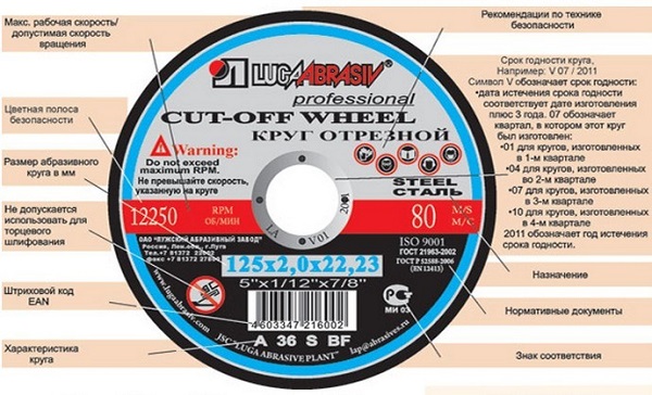 Любой абразивный круг, независимо от типа изделия, обладает специальной маркировкой, которая содержит информацию о диаметре диска, его толщине, размере посадочного места, максимальной скорости вращения.
