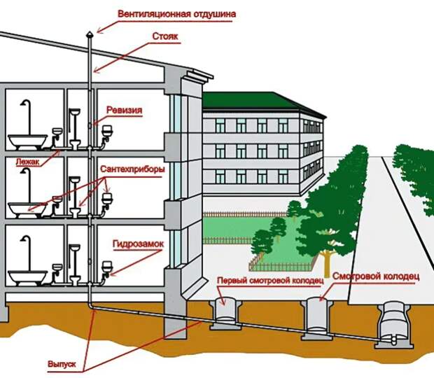 - В зданиях сточные воды собираются через санитарные приборы, подключенные к внутренней канализационной сети. Трубы диаметром 50–110 мм отводят стоки от раковин, унитазов и ванн в общедомовые стояки.