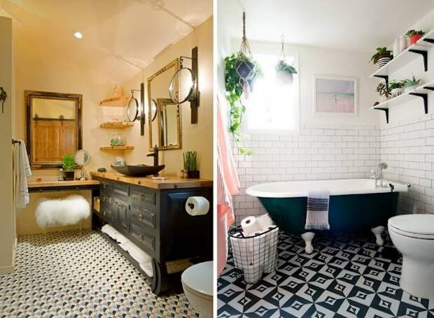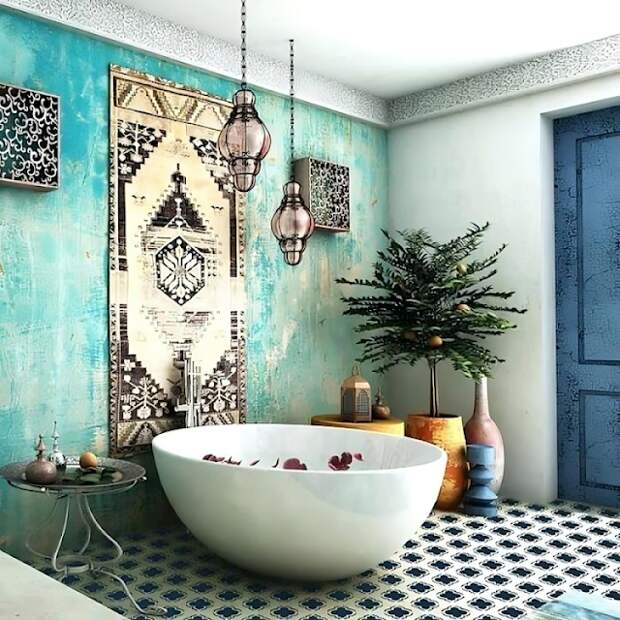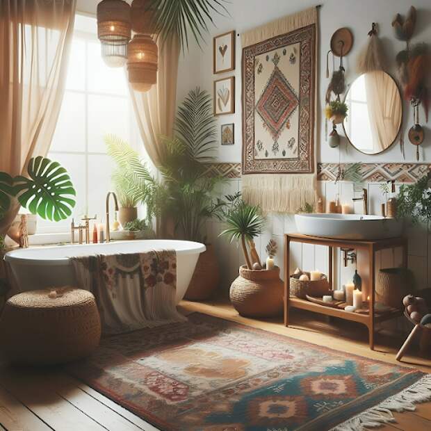 Ванная комната в стиле бохо-шик превращается в экзотический оазис, где чувственность встречается с функциональностью. Здесь могут соседствовать плетёные корзины для белья, латунные смесители, восточные плитки с геометрическим орнаментом, свечи в стекле и живые растения. Пространство дышит путешествиями и вдохновением, будто каждая деталь привезена из далёкой страны.