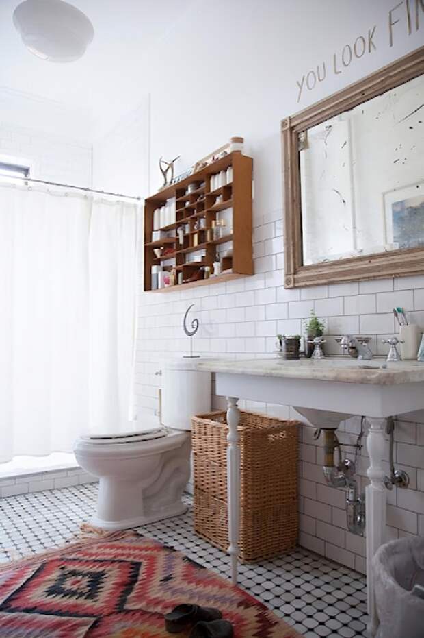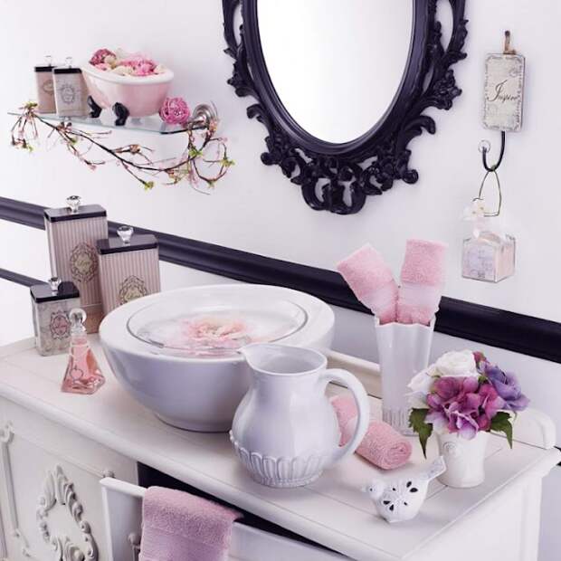 Аксессуары. Шебби шик предпочитает деликатность: полотенца пастельных тонов с вышивкой, мыльницы из керамики с лёгкими чипсами, хлопковые коврики с кружевной отделкой. Всё выполнено так, чтобы подчеркнуть эстетику «винтажного комфорта».