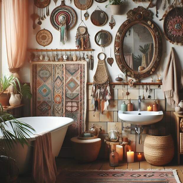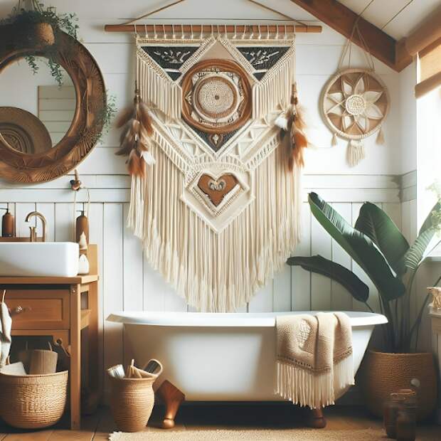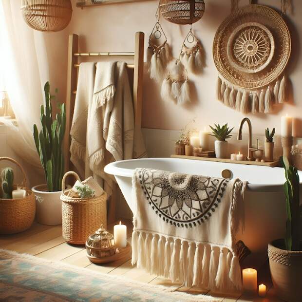 В бохо шик аксессуары яркие, текстурные и многослойные: льняные полотенца с помпонами, корзины из лозы для белья, диспенсеры и подставки в этническом стиле. Часто используются бахрома, бусины и разнообразные текстильные элементы, создавая богатый тактильный опыт.