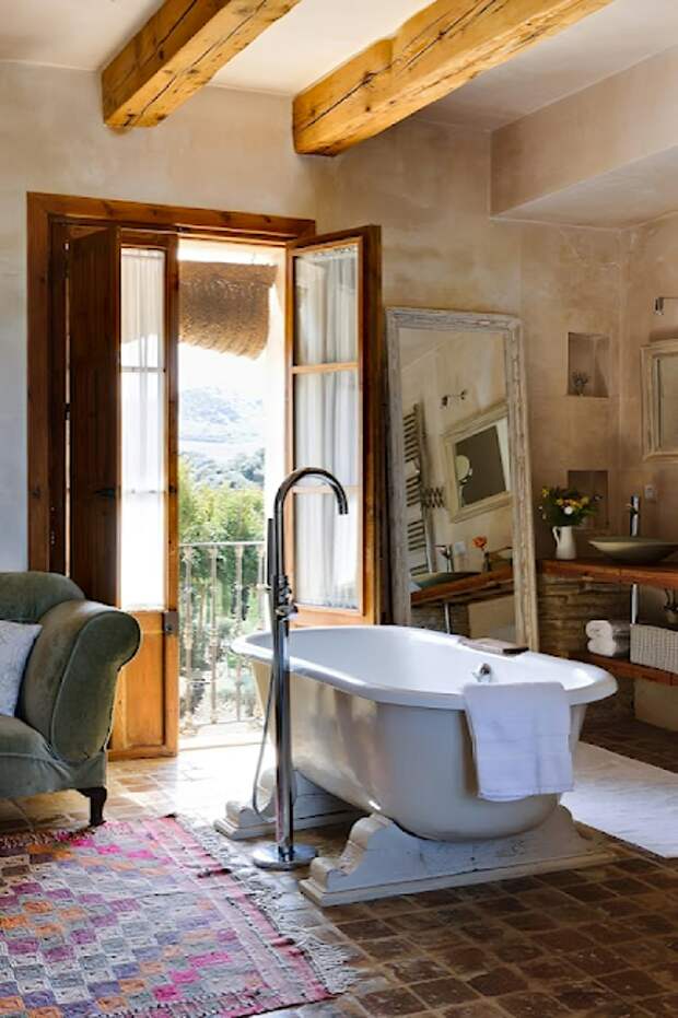 Бохо шик. В отличие от шебби, бохо шик предпочитает эклектичность и этническую текстуру. Ванны могут быть встроенными или отдельно стоящими, но чаще используют модели с простыми геометрическими формами, которые легко комбинируются с аксессуарами. Акцент делается на натуральные материалы и тактильность: каменные или керамические мойки с неровной поверхностью, медные или бронзовые раковины с аутентичной текстурой, иногда украшенные резьбой или рельефом.