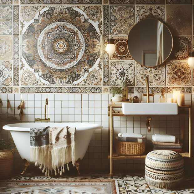 - Основа: оформите стены в нейтральные оттенки — бежевый, песочный, светло-серый, и добавьте акцентные плитки с узорами или этническими мотивами. Это создаёт фон для ярких деталей и задаёт атмосферу бохо-шика.