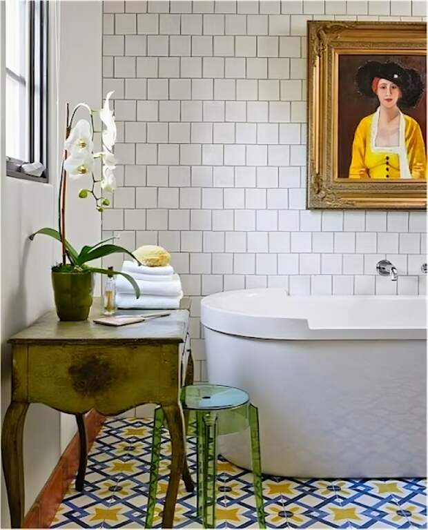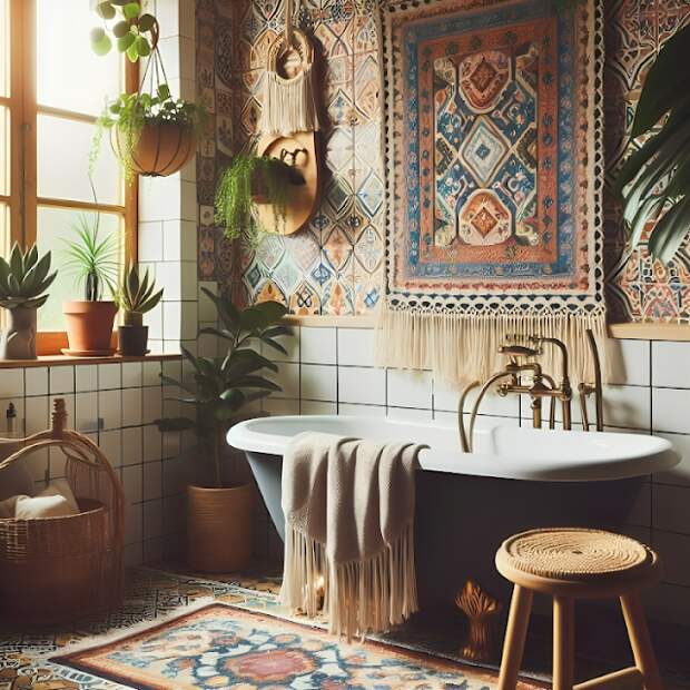 Бохо шик, напротив, делает ставку на натуральность, текстуру и тактильность, создавая ощущение свободы и экзотики. В основе — ротанг, джут, лён и бамбук, которые идеально сочетаются с керамикой с геометрическими или этническими узорами, металлом с гравировкой и другими декоративными элементами. В ванной это проявляется в плетёных корзинах для полотенец, бамбуковых полках и ковриках из натуральных волокон, которые не только функциональны, но и придают пространству "дикость" и живость. Плитка с талаверами, имитирующая мексиканскую керамику, устойчива к пару и воде, а мягкие текстильные элементы создают ощущение непринуждённого комфорта и эклектичного уюта. Каждый материал бохо-шика вовлекает в тактильное и визуальное путешествие, делая ванную комнату пространством, наполненным энергией и личной историей хозяев.