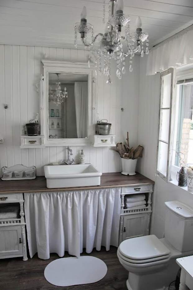 Мебель. В шебби шик мебель словно хранит память прошлых поколений: тумба под раковину из состаренного дерева с белой краской, ванна на чугунных ножках, зеркало в резной раме с патиной. Мебель низкая, уютная, с аккуратными ящиками для косметики и полотенец — всё для ощущения «домашнего уюта». Основные материалы — дерево и металл, обработанные для защиты от влаги и долговечности. Каждая вещь выглядит как винтажная находка: слегка потёртая, с налётом истории.
