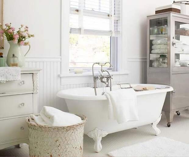 Шебби шик. В этом стиле сантехника отражает винтажную эстетику и аристократическую романтику. Ванны чаще всего выбирают чугунные или акриловые модели на декоративных ножках, имитирующих старинные: белые, слегка потёртые, иногда с эмалевыми трещинами или патиной. Раковины из фарфора с мягкими формами, с нежной цветочной росписью или с «эффектом старения», создают атмосферу ретро-спа.