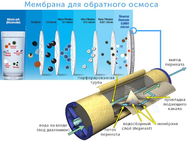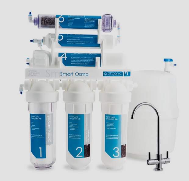 Системы обратного осмоса используют полупроницаемую мембрану (0,0001 мкм), которая пропускает только воду и задерживает 98–99% примесей: соли, тяжелые металлы, бактерии. Обычно включают 4–6 ступеней: механическая очистка → уголь → мембрана → минерализатор. Производительность — 5–15 л/час, с накопительным баком 5–12 л.