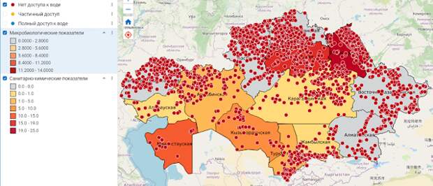 Однако эта статистика скрывает региональные диспропорции: в крупных городах, таких как Алматы и Астана, инфраструктура относительно развита, а в сельских и малых населённых пунктах вода часто поступает из устаревших систем, подверженных загрязнению.
