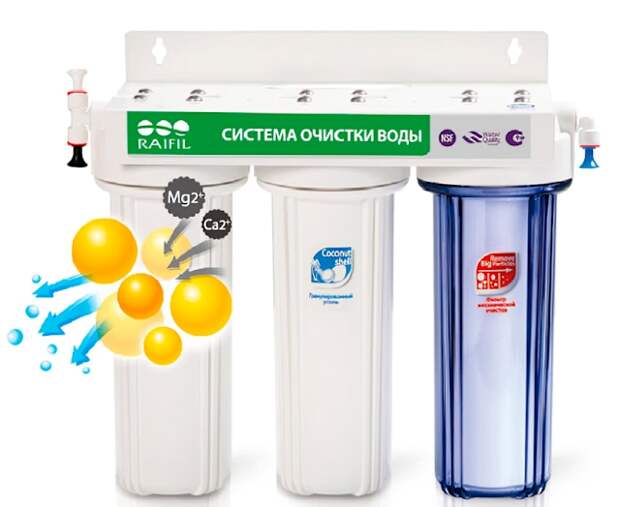Регулярная регенерация проводится солевым раствором, срок службы смолы — 1–3 года. Плюсы — мягкая вода для кожи и экономия энергии, минусы — повышение содержания натрия в воде, необходимость солевого бака. В жестких регионах (север, центр) такие фильтры оптимальны.