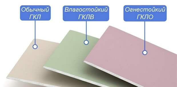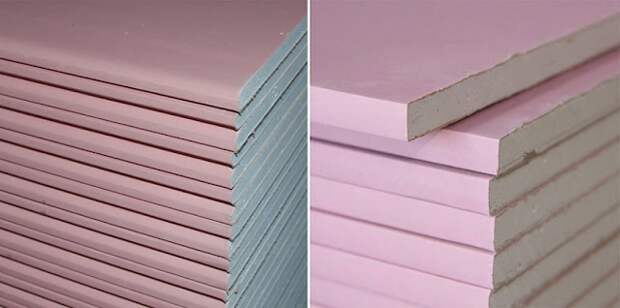 Различить виды гипсокартона можно по цветной маркировке. Влагостойкий материал зеленого цвета, простой – серого, огнестойкий имеет пометку красного или розового оттенка.